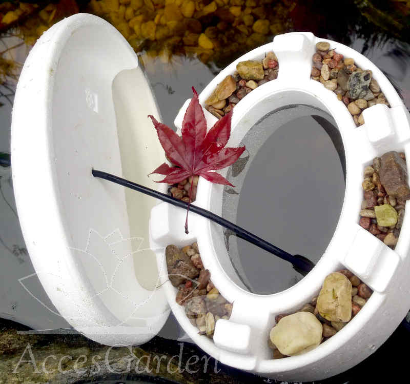 sztuczny przerębel do oczka wodnego po należytym obciążeniu piaskiem lub żwirem należy umieścić w oczku wodnym przykrywając pokrywa przez którą możemy przełożyć wężyk do napowietrzacza.